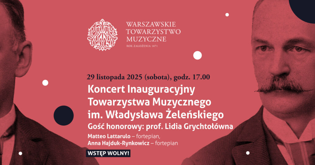 Warszawskie Towarzystwo Muzyczne zaprasza na uroczysty koncert inaugurujący działalność Towarzystwa Muzycznego im. Władysława Żeleńskiego, który odbędzie się w historycznych wnętrzach Pałacu Szustra.