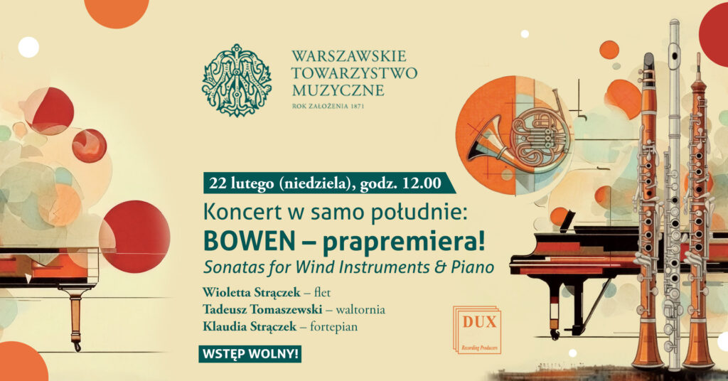 W niedzielę 22 lutego o godz. 12.00 usłyszymy sonaty na instrumenty dęte i fortepian angielskiego kompozytora Edwina Bowena. Artyści zaprezentują utwory z najnowszego albumu „Bowen: Sonatas for Wind Instruments & Piano”, który tego dnia będzie miał swoją oficjalną premierę.